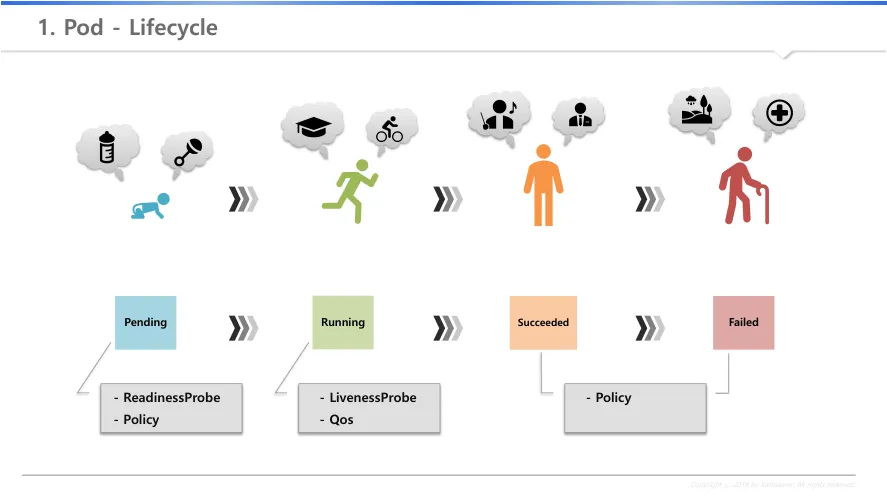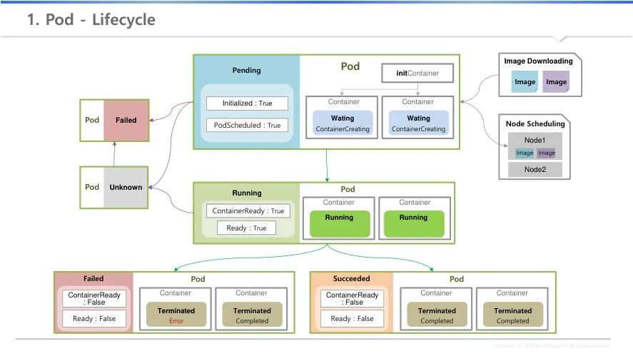 Unknown : Pending 또는 Running 상태에서 발생, 주로 통신 장애, 시간이 길어지면 Failed로 변경